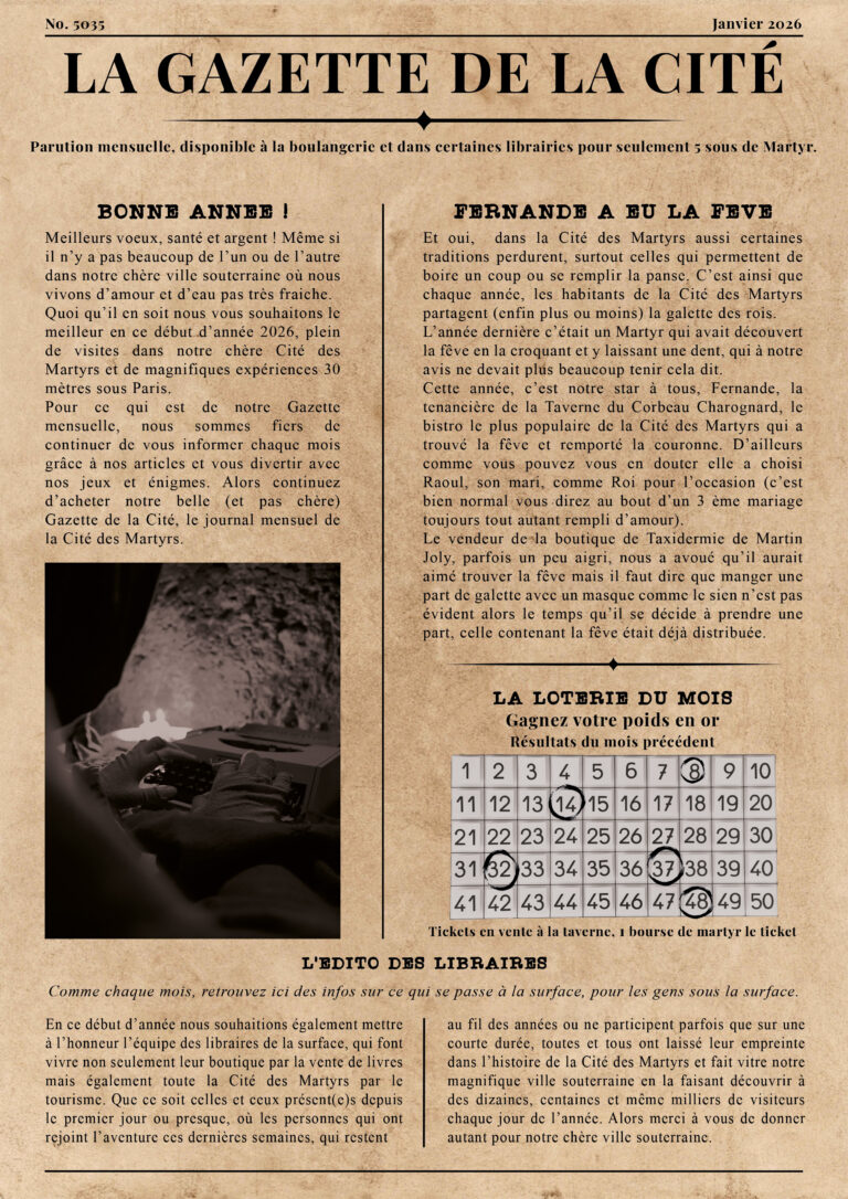 La Gazette de la Cité est un journal mensuel qui couvre les actualités du mois de la Cité des Martyrs et de ses habitants.  En plus des dernières nouvelles et événements locaux, chaque numéro comprend également des jeux, des devinettes et d’autres informations secrètes. Les lecteurs peuvent ainsi s’informer tout en s’amusant et en découvrant des anecdotes surprenantes.
